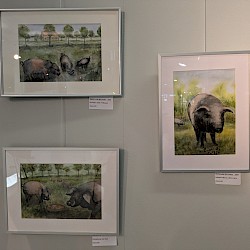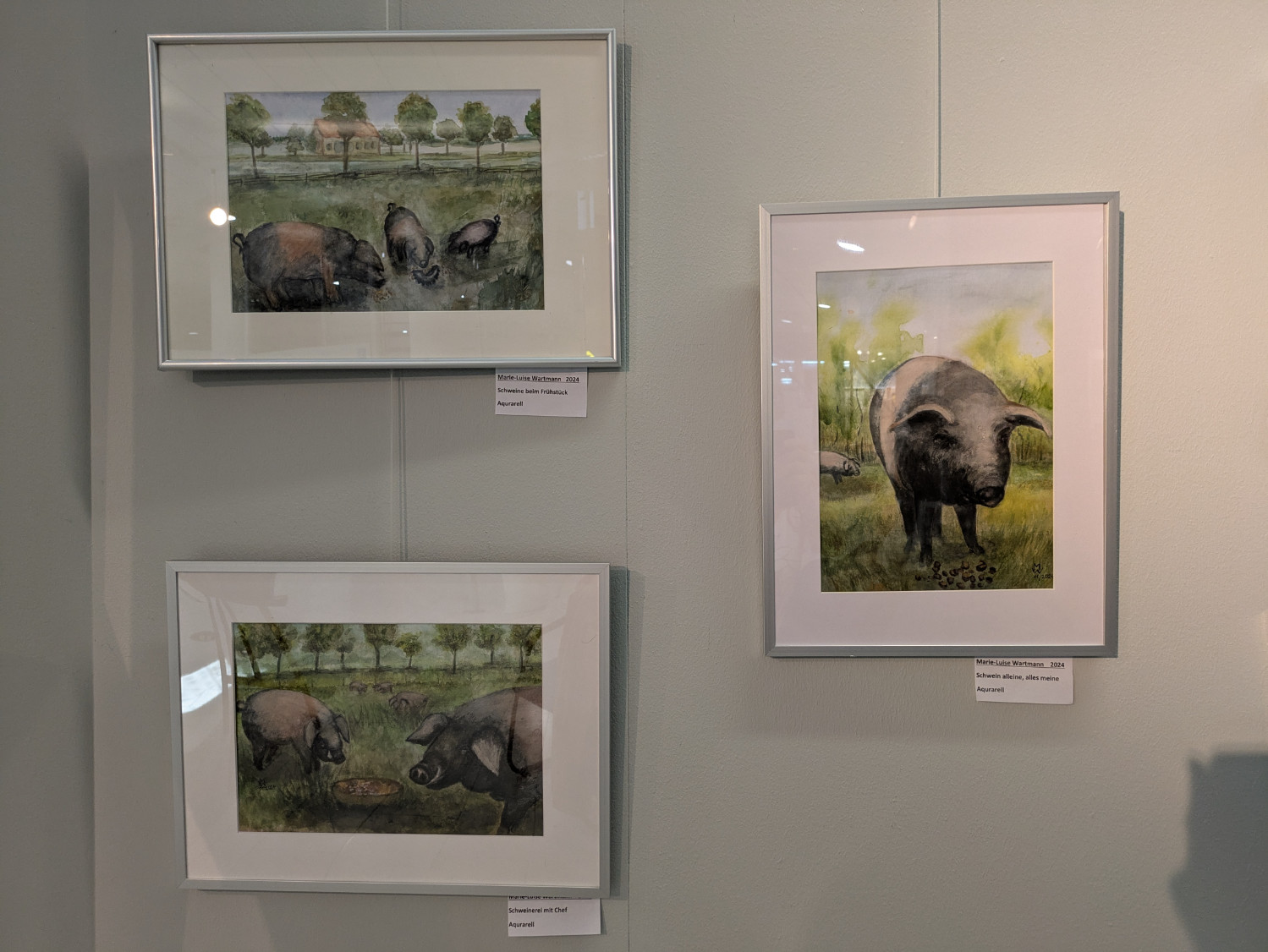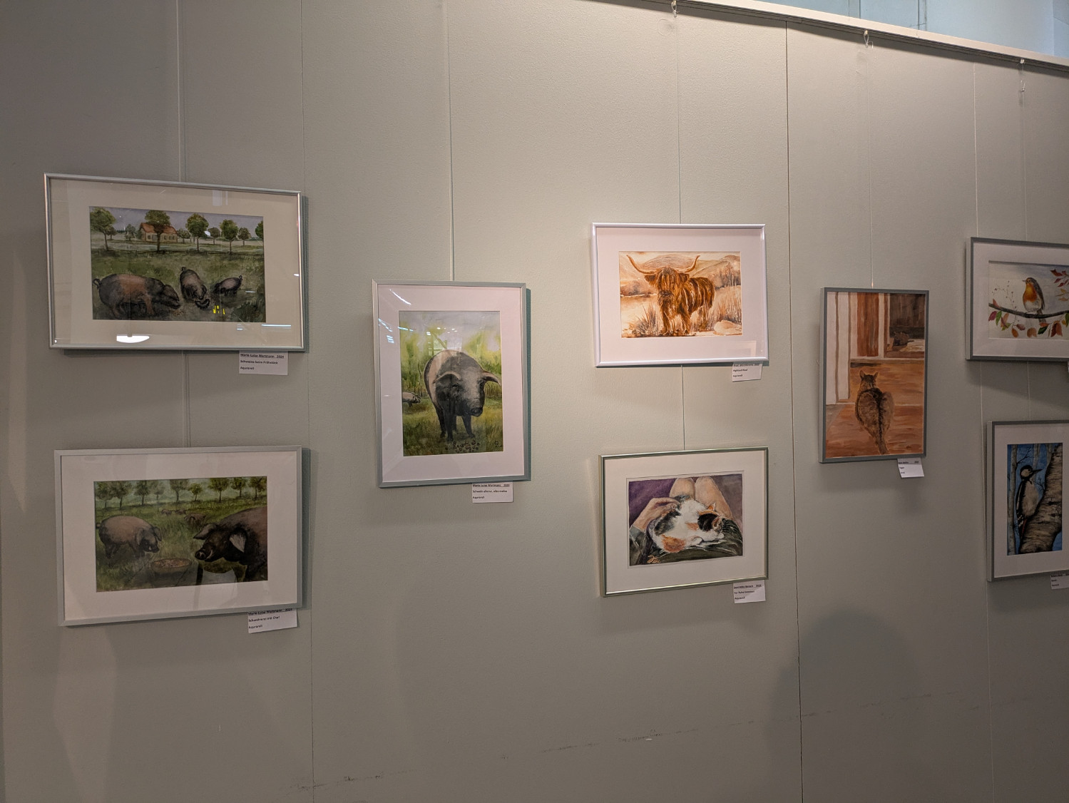 Im Sommer 2024 trafen wir uns bei einem Hobbybauern in unserem Ort. Er stellte uns seine Tiere vor und wir beobachteten und skizzierten die riesigen Sattelschweine, die aufmerksamen Laufenten, die hübschen Rassehühner. Das brachte uns darauf, auch noch andere Tiere einmal in den Mittelpunkt zu rücken. Nun konnten wir unsere ,,tierisch guten“ Ergebnisse zeigen.