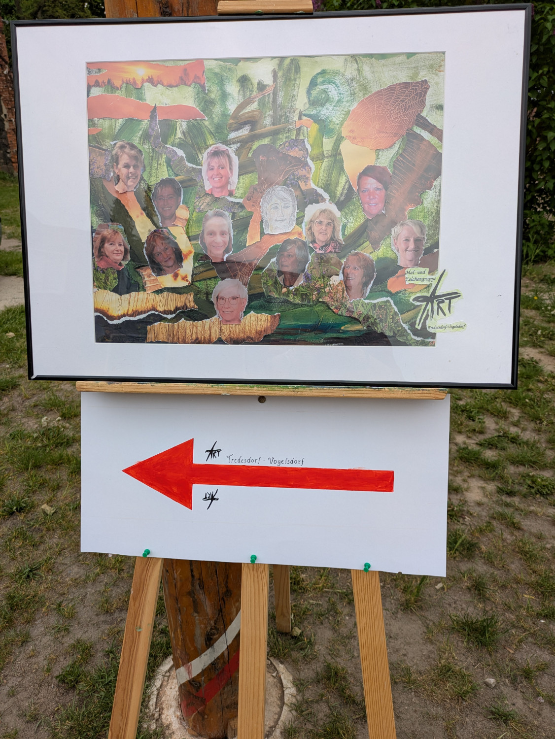 Sonntagnachmittag fand die Ausstellung der Malgruppe ART auf dem Grundstück im Ortsteil Vogelsdorf der Gemeinde Fredersdorf-Vogelsdorf statt. Da die Gruppe im September vor 32 Jahren gegründet wurde, fanden die jetzigen Mitglieder den Zeitpunkt für eine erste Ausstellung im Grünen sehr passend. Gleichzeitig war es für die Künstler eine Herausforderung ca. 160 Bilder, Zeichnungen und Collagen im Freien zu präsentieren. Auf Staffeleien , Tischen, Stühlen, flatternd am Gartenzaun oder an Bäume und Sträucher gelehnt, bot der Garten einen ungewöhnlichen und farbenfreudigen Anblick. Das fanden auch ca. vierzig interessierte Gäste, die sich bei Sonnenschein an den vielen verschiedenen Bildern erfreuten.